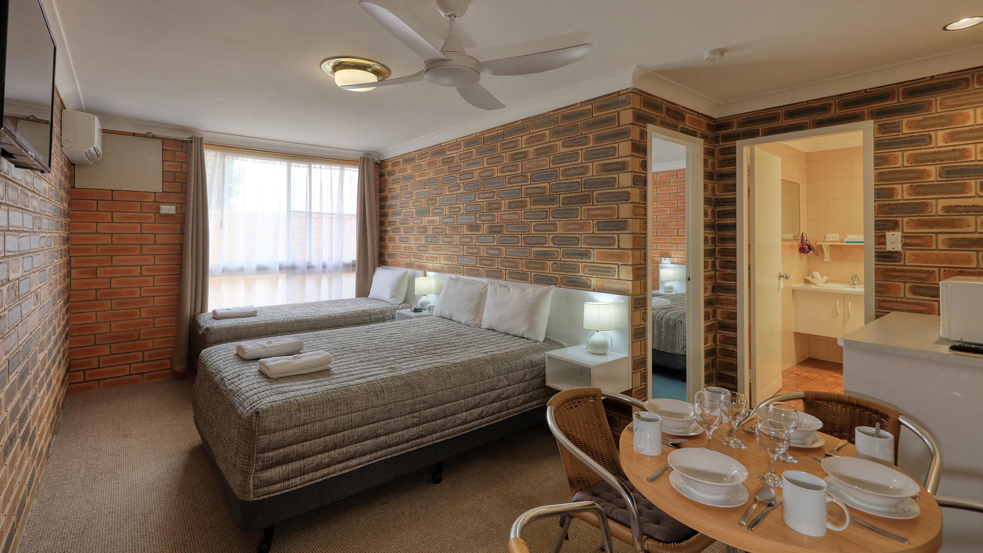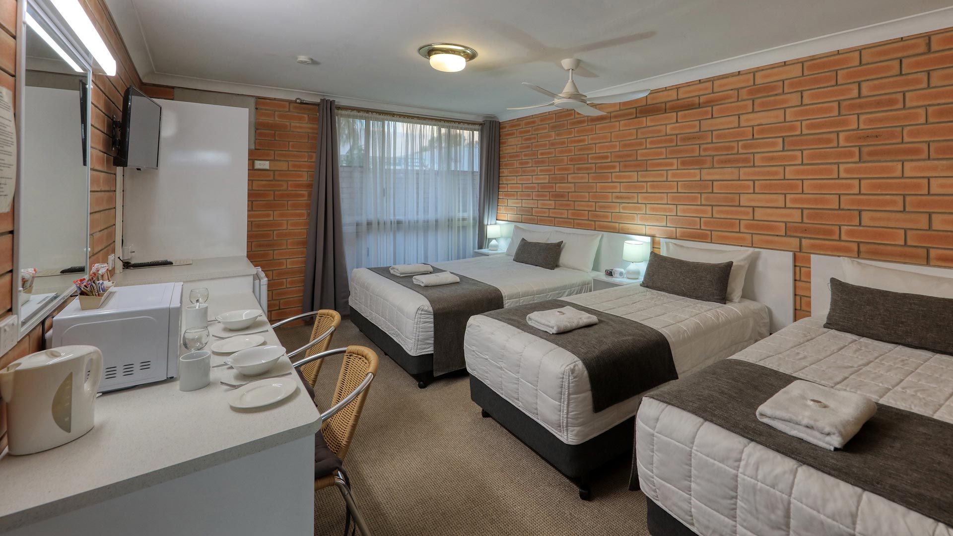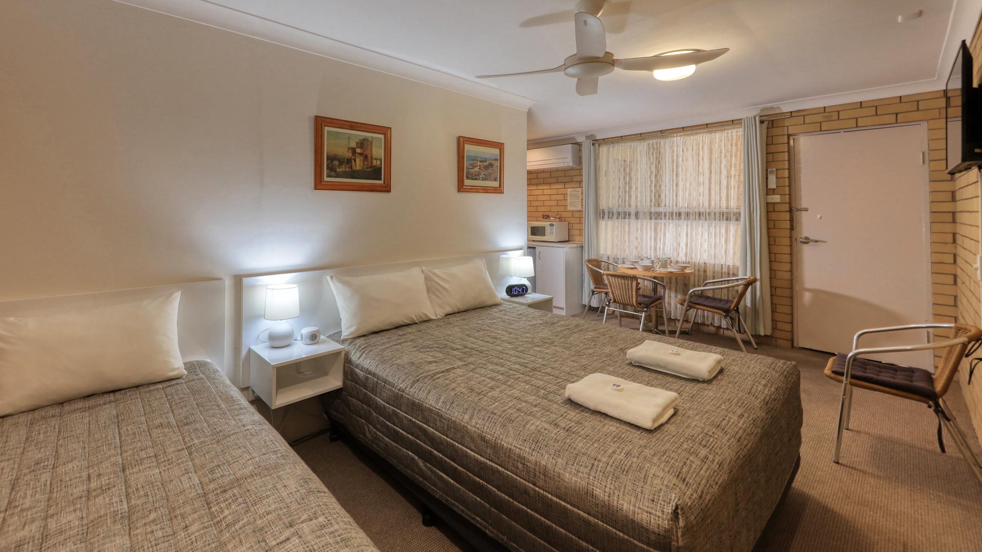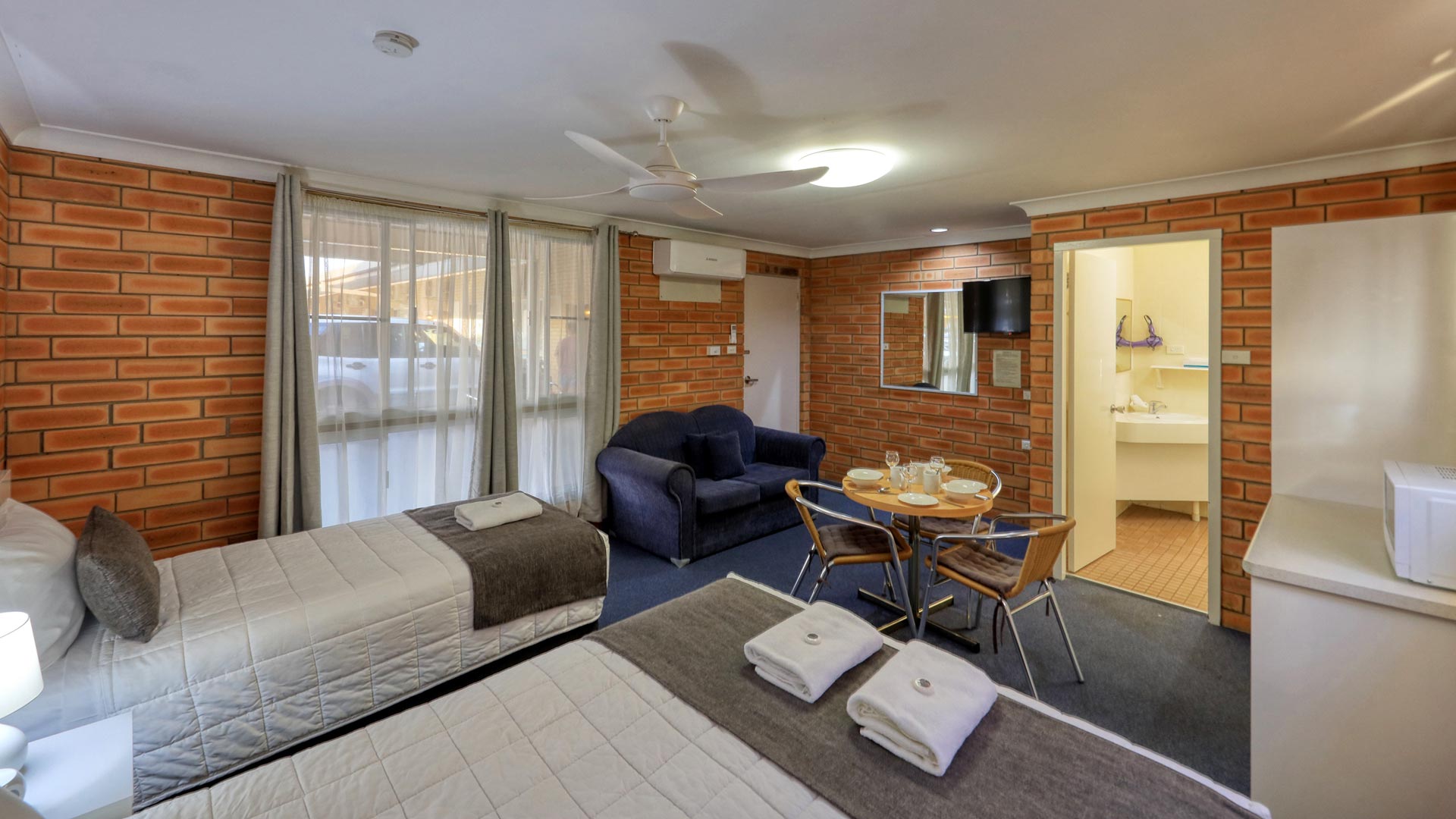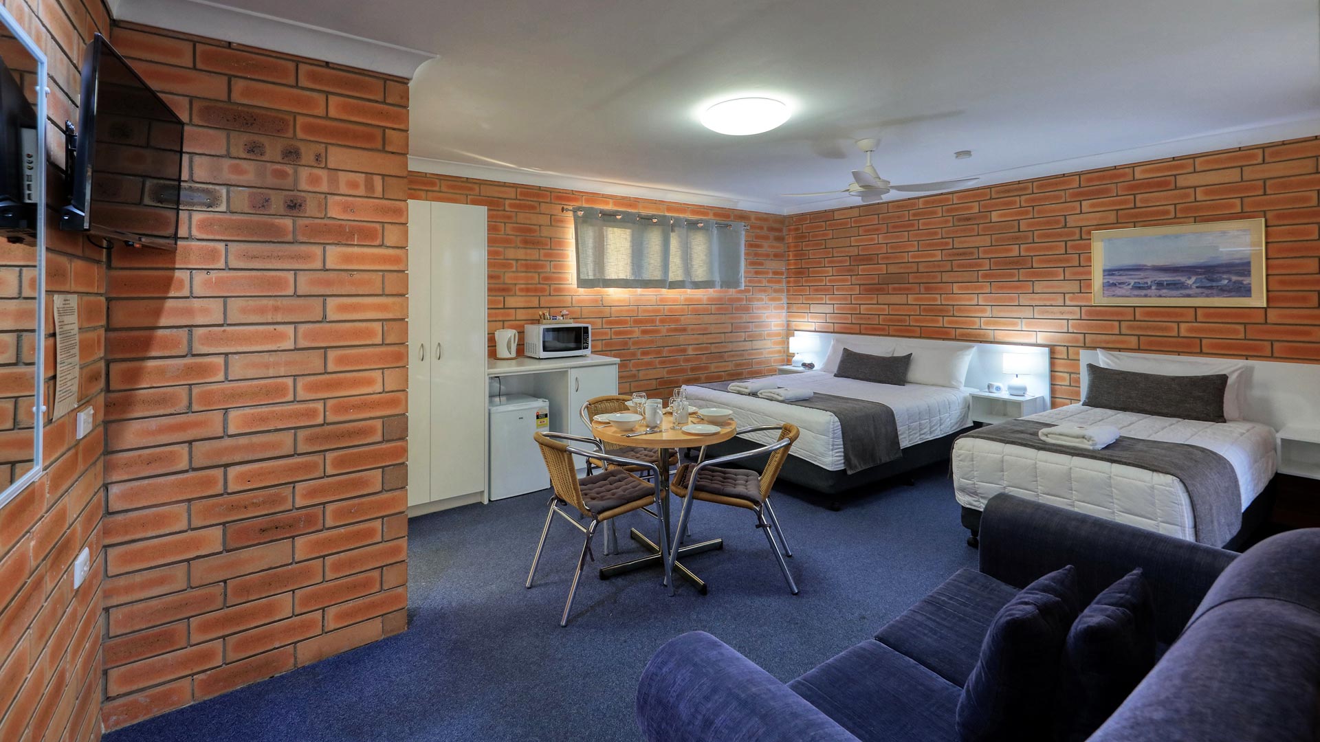 These two room suites have two queens and two single beds, with ensuite and a seating area. Each room is equipped with a microwave, toaster, a kettle, tea and coffee facilities, a shower, free toiletries and a desk. All rooms have a private bathroom with a hair dryer. Guests can enjoy access to an outdoor swimming pool, barbecue and free WiFi.
